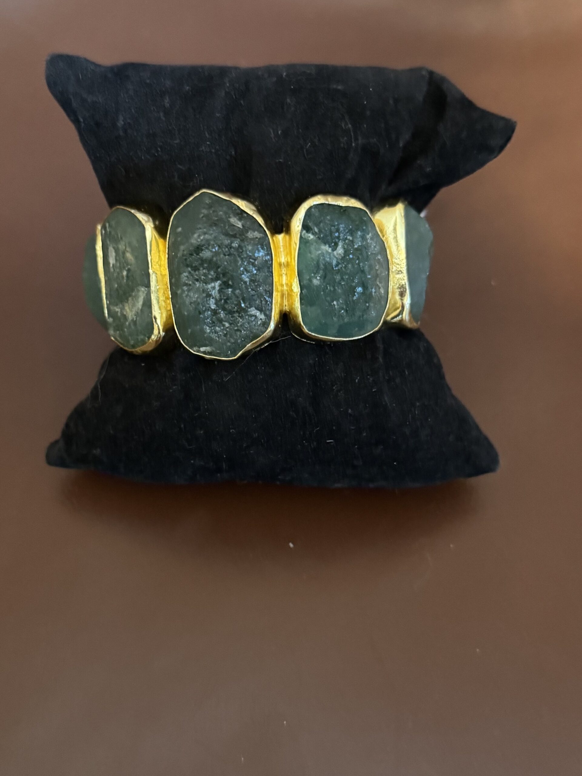 Full 1″ stones of raw Adventurine are set in golden bezels all around the bracelet.