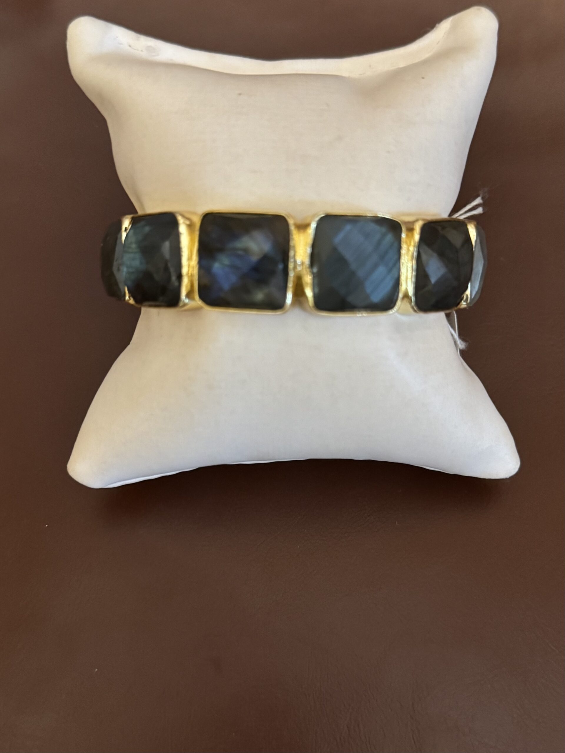 1/2″ faceted stones of Labradorite are set in golden bezels all around the bracelet.