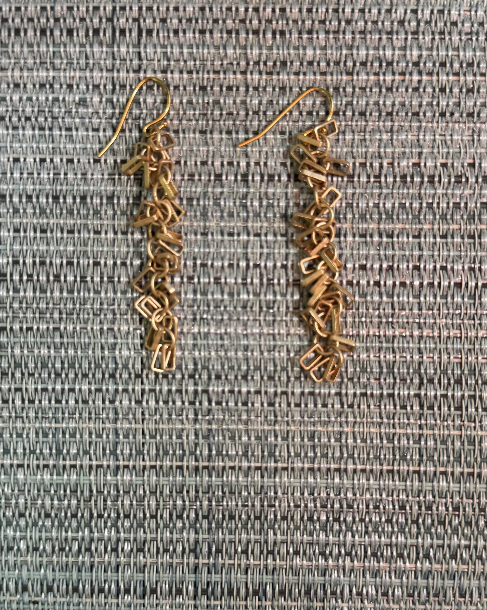 Quirky and fun golden dangle earrings made of open rectangles and circles.