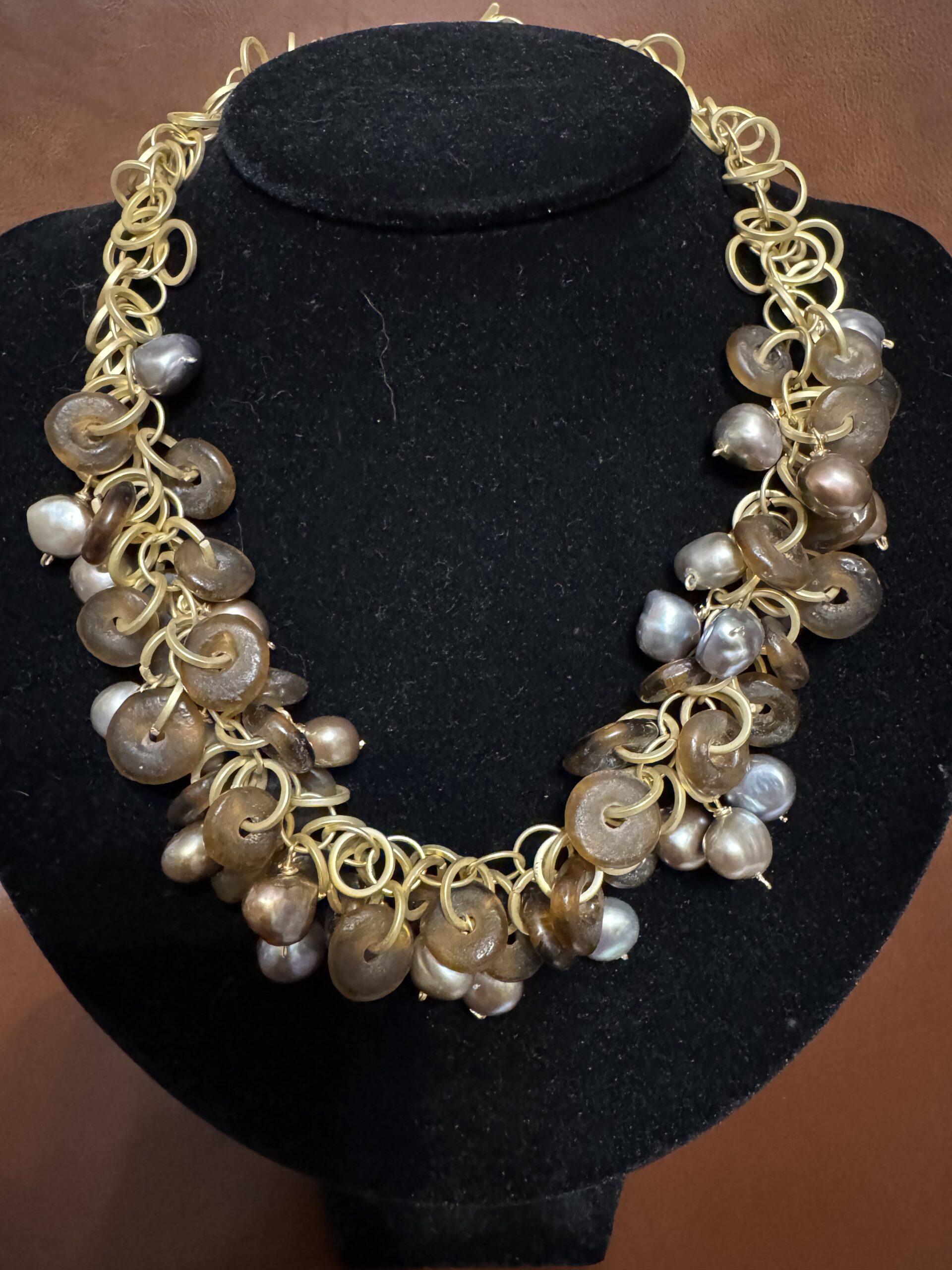 A 16″ +4 multi loop chain holds a mass of natural multi colored fresh water Pearls and discs of caramel colored natural Sea Glass.