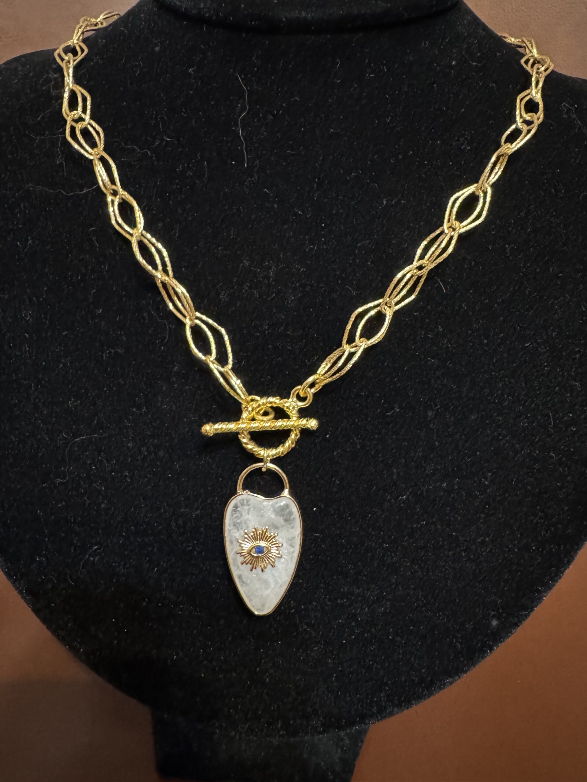 18″ of an interesting double linked matte chain has a toggle closure in the front.